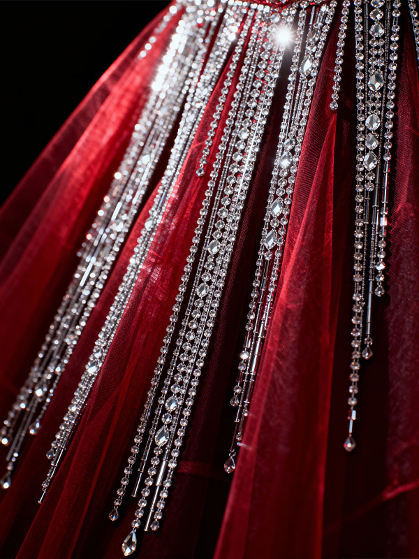Designers favor vertically cascading crystal fringe, symmetrical geometric embroidery structures, and platinum-silver stone tones that amplify the visual elegance of every gown. These elements transform evening dresses into moving sculptures of light.