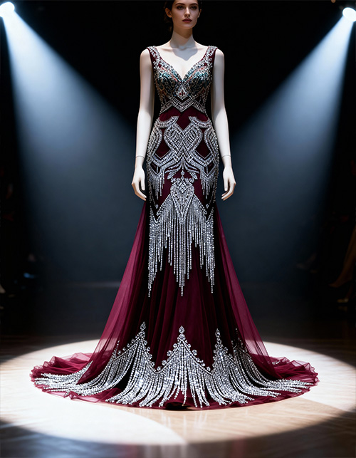 Black, champagne, and deep burgundy remain the most commercially successful base colors, while platinum silver stones create striking contrast and couture depth.