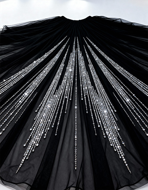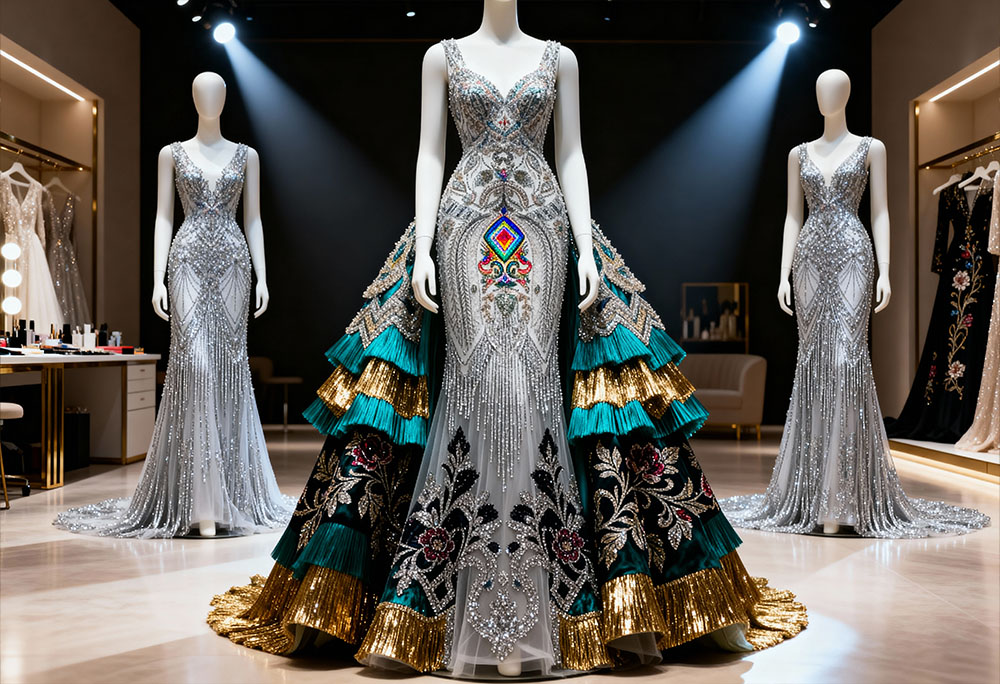 Crystal fringe tulles have become the most iconic fabric category in Kuwait’s high-end evening wear market. Designers prefer vertical dense fringe embroidery because it amplifies movement, light reflection, and stage presence during weddings, gala nights, and luxury celebrations.