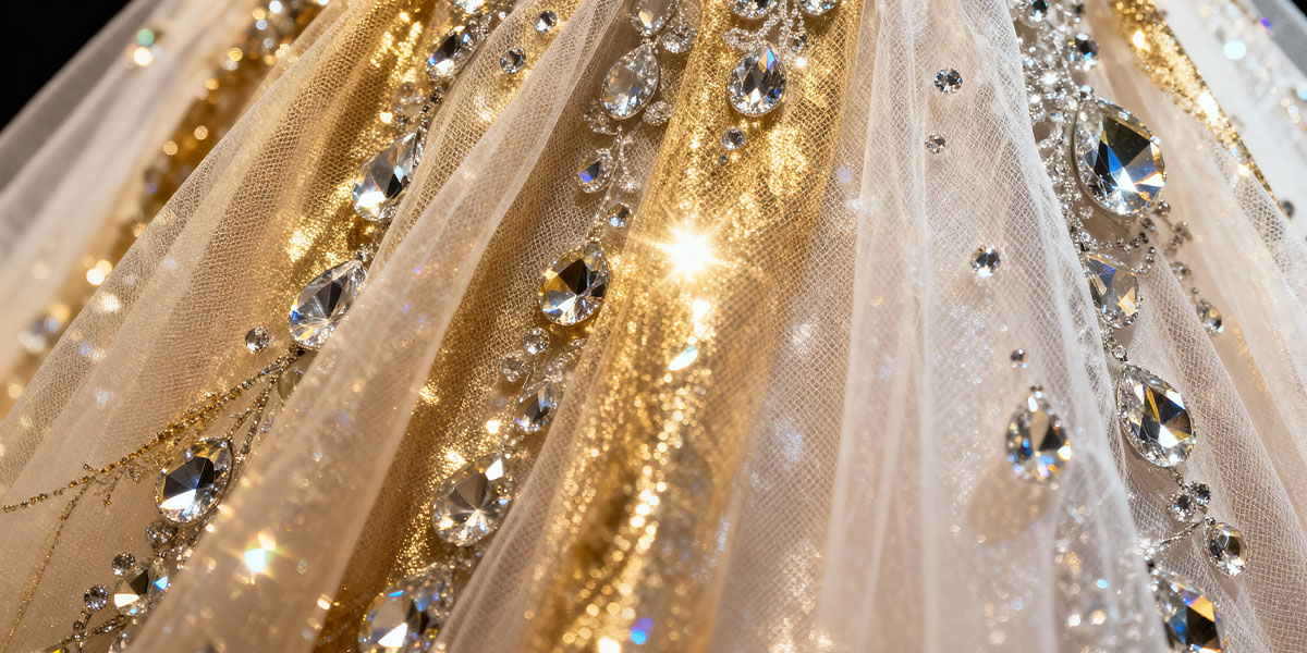 Beaded tulle fabrics represent the soul of Dubai glamour. Their three-dimensional sparkle, layered depth, and bold shine make them ideal for gala dresses, bridal couture, and luxury evening gowns worn at elite social events.