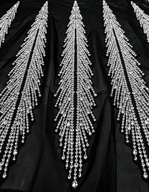 Turkish manufacturers fulfill this demand by supplying consistent bulk volumes with identical embroidery symmetry, calibrated stone density, and stable base tulle quality, which are critical for large collection productions.